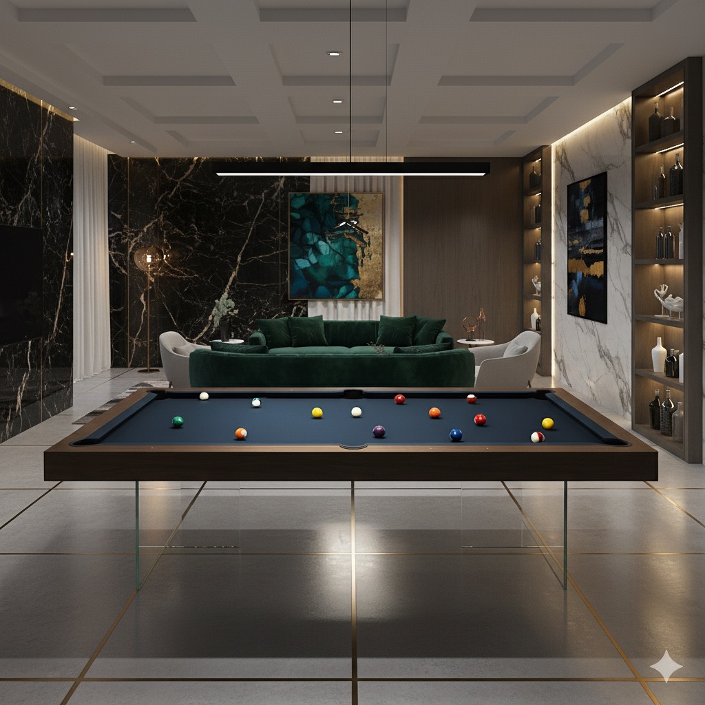 * Gambe in Vetro: L’elemento distintivo di Crystal sono le gambe in vetro trasparente, che donano al biliardo un ineguagliabile senso di leggerezza e modernità, facendo sembrare il piano di gioco quasi fluttuante nell’ambiente.